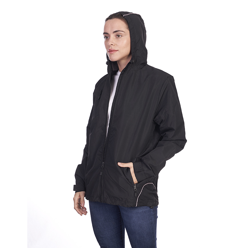 Campera fabricada en Taslan, una tela con recubrimiento impermeable y protección UV. El tejido interior es una malla 100% polyester que permite la ventilación de la prenda. Posee tres Bolsillos con cierre, dos laterales inferiores y uno lateral derecho superior y puños con regulación por velcro. En el extremo superior del cierre, posee una solapa cobertora. Regulación interna en ruedo, por cordón elÔstico y tanca. Posee capucha con 2 puntos de ajuste y detalles gris reflex.